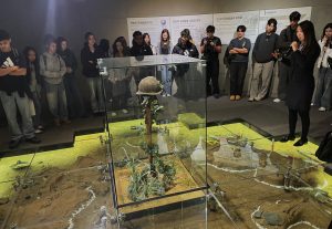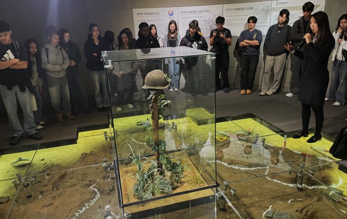 Cadets from Daegu Middle High School in Daegu, South Korea gather around the “Helmet with Holes” exhibit at the Waegwan War Memorial Museum, which collects and displays authentic artifacts from the Korean War. (Photo by Cadet Olivia Buettner)