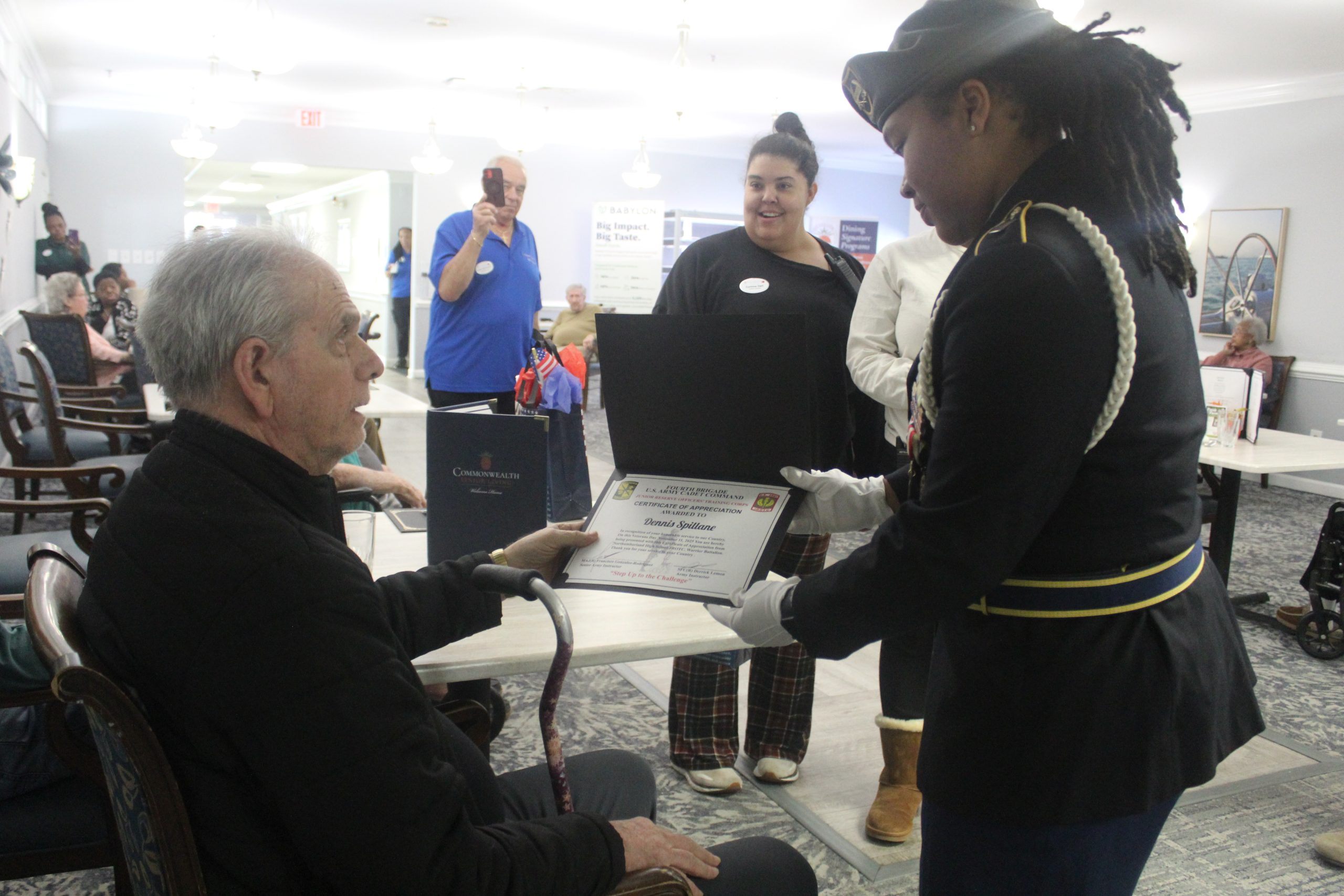 Army JROTC Cadet Kiera Coleman presents a certificate of appreciation to a veteran. (Photo by Cadet Keymah J. Clarke)